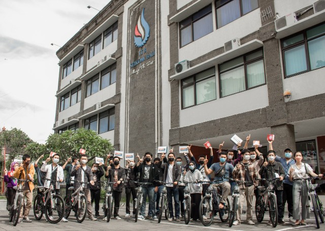 LITERASIPOST.COM, DENPASAR | Bukan hanya Presiden Jokowi yang bisa bagi-bagi sepeda gratis kepada masyarakat, ITB STIKOM Bali pun bisa. Pada Kamis (28/10/2021) bertepatan momentum Hari Sumpah Pemuda, ITB STIKOM Bali membagikan 12 unit sepeda gunung secara gratis kepada mahasiswa. Tak hanya sepeda, 9 unit laptop dan 9 unit modem juga dibagikan secara gratis kepada para mahasiswa. Total nilainya lebih dari Rp100 juta. Para mahasiswa angkatan 2021 yang beruntung itu adalah mereka yang mendaftar sebagai calon mahasiswa Gelombang Khusus pada November 2020, Gelombang I dan Gelombang II pada JanuarI 2021.