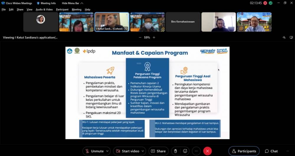 LITERASIPOST.COM, JIMBARAN | Universitas Udayana (UNUD) melalui Biro Kemahasiswaan secara maraton di hari yang sama Rabu (20/07/2022) menyelenggarakan dua kali sosialisasi terkait Program Wirausaha Merdeka Kemdikbudristek di Universitas Udayana Tahun 2022 secara daring melalui aplikasi Cisco Webex. Sosialisasi pertama mengundang para Dekan, Para Wakil Dekan Bidang Kemahasiswaan, Para Koordinator Program Studi, Calon Dosen Pendamping Lapangan (DPL), serta mahasiswa di lingkungan Universitas Udayana, dan berselang satu jam selanjutnya dilaksanakan sosialisasi kedua dengan mengundang para Pimpinan PTN/PTS se Bali.