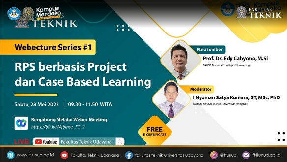 Fakultas Teknik Universitas Udayana telah melakukan Webecture terkait RPS berbasis Project dan Case Based Learning secara online, ini merupakan Kegiatan atau agenda dari Fakultas Teknik Universitas Udayana. Kegiatan diawali sambutan dari Wakil Dekan Bidang Kemahasiswaan dan Informasi Ir. I Nyoman Budiastra, M.Erg. dengan menghadirkan narasumber Prof. Dr. Edy Cahyono, M.Si dari FMIPA Universitas Negeri Semarang dan dimoderatori oleh I Nyoman Satya Kumara, ST, MSc, PhD, dan dihadiri oleh para dosen di lingkungan Fakultas Teknik Universitas Udayana.
