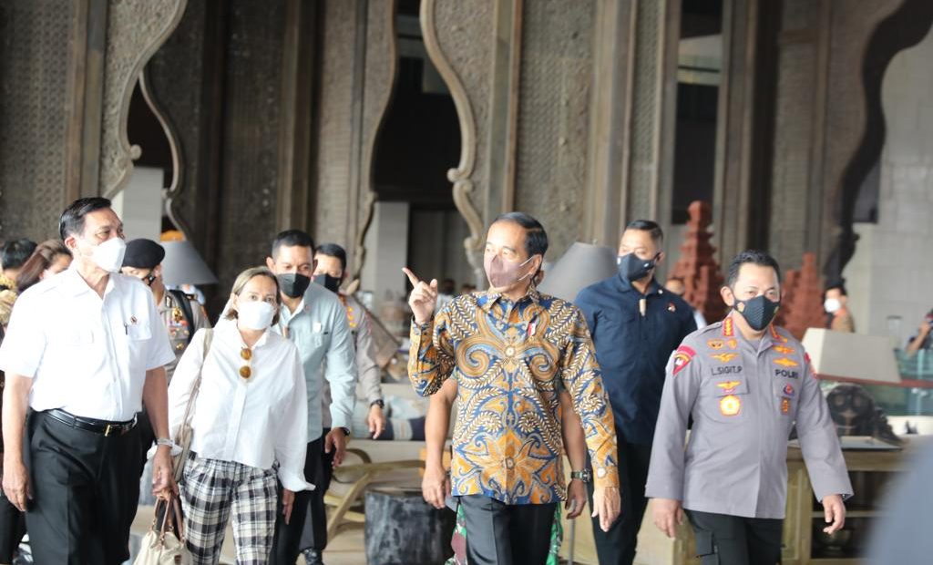 Kedatangan Presiden di lobi utama The Apurva Kempinski Hotel disambut oleh Menkomarves Luhut Binsar Panjaitan, Kapolri Jenderal Polisi Drs. Listyo Sigit Prabowo MSi., Panglima TNI Jenderal TNI Andika Perkasa didampingi Kapolda Bali Irjen Pol Putu Jayan Danu Putra, SH., MSi dan Pangdam IX/Udayana Mayjen TNI Maruli Simanjuntak SIP.