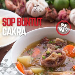 Arjuna Bistro juga menawarkan berbagai menu promo kemerdekaan yaitu Sop Buntut dengan harga IDR 95.000 nett disajikan dengan nasi putih. Kehangatan sop tradisional Indonesia ini harus dicoba selama menginap yang memiliki rasa yang sangat gurih dan akan menciptakan pengalaman tersendiri di saat menikmati sop buntut The Cakra Hotel Bali.