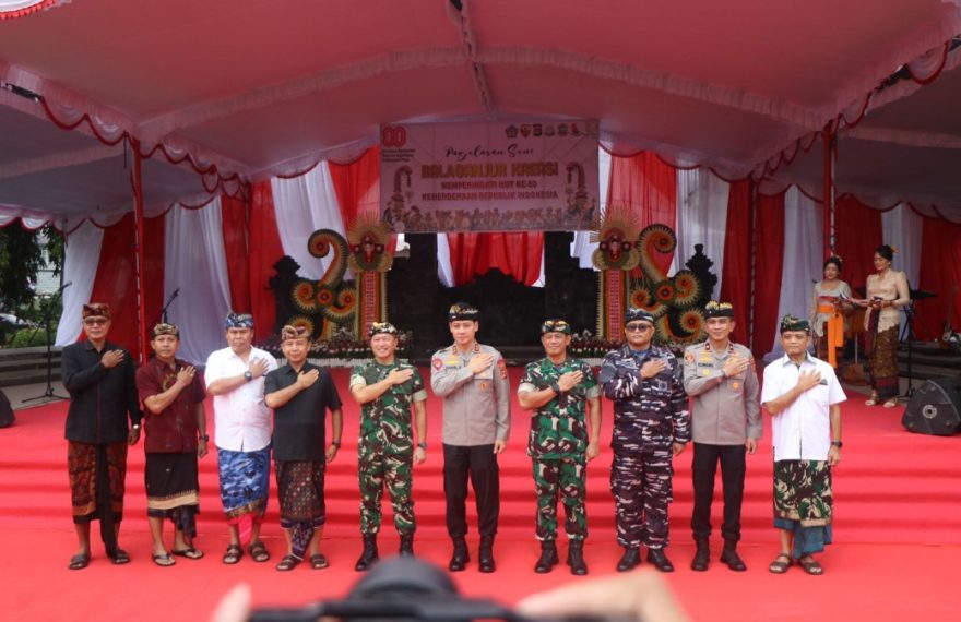 LITERASIPOST.COM – DENPASAR | Kapolda Bali Irjen Pol. Daniel Adityajaya, S.I.K., M.Si., didampingi oleh Wakapolda Bali Brigjen Pol. Komang Sandi Arsana, S.I.K., M.H., serta para Pejabat Utama Polda Bali, menghadiri Pagelaran Seni Baleganjur dalam rangka memeriahkan Hari Ulang Tahun ke-80 Kemerdekaan Negara Republik Indonesia tahun 2025 yang dilaksanakan di Lapangan