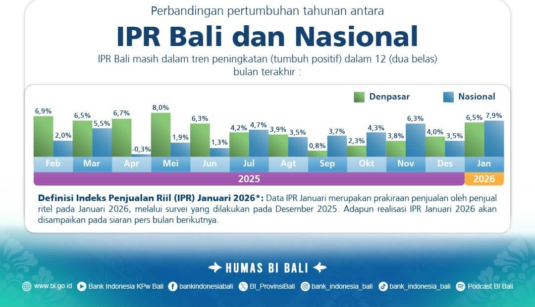 LITERASIPOST.COM – Denpasar | Penjualan eceran di Provinsi Bali pada bulan Januari 2026 diprakirakan meningkat secara moderat. Hal ini tercermin dari Indeks Penjualan Riil (IPR) Bali sebesar 124,2 atau secara tahunan tumbuh 6,5% (yoy), dan masih berada di level optimis (>100). Secara