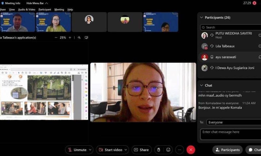 LITERASIPOST.COM, DENPASAR | UPT Bahasa Universitas Udayana melalui “Warung Perancis” menyelenggarakan pelatihan Bahasa Perancis bagi dosen di lingkungan Universitas Udayana melalui Webex Meeting, Rabu (15/6/2022). Pelatihan Bahasa Perancis ini merupakan salah satu bentuk kegiatan kerjasama dengan Institute Francais Indonesia dengan menghadirkan Ms Léa Talbeaux, mahasiswa