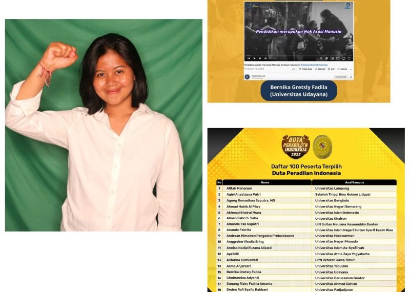 LITERASIPOST.COM, DENPASAR | Salah satu mahasiswi FH Unud angkatan 2019, Bernika Gretsly Fadila kelahiran Kediri, Jawa Timur berhasil meraih beberapa prestasi di tahun 2022. Pertama, Bernika berhasil meraih Juara II Kompetisi Video Menuju Ulang Tahun ke-22 Hukum Online dengan judul Pendidikan merupakan Hak Asasi Manusia yang diumumkan pada 15 Juli 2022. Dia menyisihkan 50