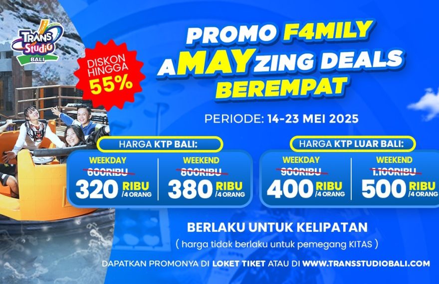 LITERASIPOST.COM – DENPASAR | Bulan Mei menjadi makin seru dengan kehadiran promo spesial dari Trans Studio Theme Park Bali: “Family aMAYzing Deals Ber-4”. Selama periode 14–23 Mei 2025, pengunjung bisa menikmati paket hemat untuk 4 orang—sempurna untuk keluarga maupun teman dekat yang ingin merasakan pengalaman bermain yang berbeda di indoor theme park di Bali.