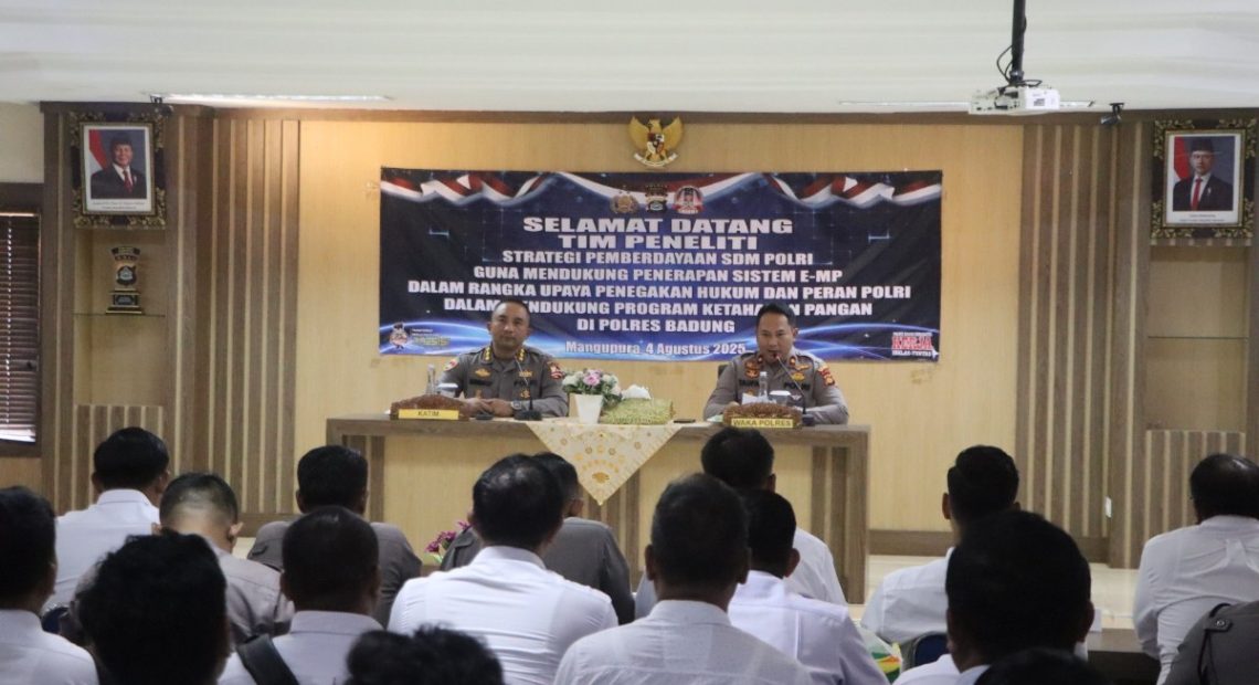 LITERASIPOST.COM – BADUNG | Polres Badung menerima kunjungan dari Tim Pusat Penelitian dan Pengembangan (Puslitbang) Polri pada Senin (4/8/25) bertempat di Aula Polres Badung, dalam rangka pelaksanaan penelitian dan evaluasi yang bertajuk strategi pemberdayaan SDM Polri guna mendukung penerapan sistem elektronik manajemen penyidikan (E-MP) dalam rangka upaya penegakkan hukum dan pengkajian tentang peran polri dalam mendukung program ketahanan pangan.