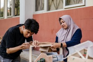 Salah satu inovator (kanan) membuat prototipe low-fi didampingi tim Fab Lab Bali dan mahasiswa Politeknik Negeri Bali. (Foto: Literasipost)